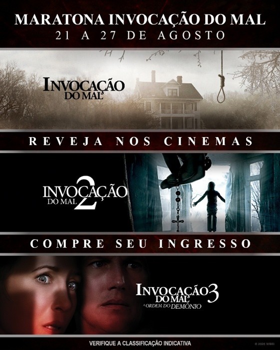 Fãs de terror já podem se preparar para reviver as histórias que assombraram gerações. A Warner Bros. Pictures Brasil acaba de anunciar o retorno dos três primeiros filmes de Invocação do Mal às telonas, em uma maratona especial entre os dias 21 e 27 de agosto. As sessões antecedem o aguardado lançamento da conclusão da franquia, Invocação do Mal: O Último Ritual, que chega aos cinemas em 04 de setembro. A pré-venda para as reexibições da franquia já está disponível.